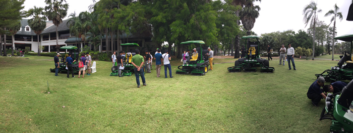 三天的培訓,時間安排緊湊有序,每天早晨七點準時乘車出發去培訓地點。前兩天培訓安排在Lakewood高爾夫球場,最后一天的服務培訓則安排在迪爾培訓中心。首先從A系列最先進技術Tech-control系統開始模擬操作學習,通過顯示屏操控、設定、了解整車的運行、剪草、維修、診斷等功能。Tech-control可視界面,具備指尖控制功能,不僅有助于實現出色的剪草效果,還可提高機器的工作效率。然后我們分組圍繞機器,進行最直觀的實機學習和討論,在輔導老師的提示下,識別并列出每款A系列機器的新增功能、改進及變化之處。之后老師通過一張張機器部位卡片和實際部件,清晰明了地講解每個機型的每個改進部位,不僅讓銷售人員們對機器的部件有更加清楚地認知,而且對部件的位置、形狀和區別,都有了深刻的印象,值得我們學習借鑒。最后根據這兩天的學習,每個人都親自上車實機演示,上車前設置好剪草、運輸、轉彎速度,手指輕按Tech-control操作平臺按鈕,即可感受自動巡航功能帶來的前所未有的操作員感受。通過課堂理論的學習,以及室外場地的實機操作,使我們對A系列的新產品了解的更加透徹。在總結會上,老師準備了很多A系列新功能的小標題,通過游戲傳球的方式,讓大家利用小標題展開話題進行講解,課堂氣氛生動活潑,學員參與話題積極踴躍,而李國強對7200A在球場意外停機處理辦法的細致全面的講解,贏得了學員們熱烈的掌聲。