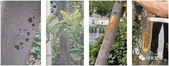 筆者上周在河南等地走訪各大公園、主干道路時(shí)發(fā)現(xiàn),櫻花、海棠等中等喬木的樹木葉片開始發(fā)黃枯萎,葉片掉落,很多養(yǎng)護(hù)人員誤認(rèn)為是葉片病害,葉噴百菌清等殺菌農(nóng)藥,卻不見起色;待到后期主干、主枝出現(xiàn)潰瘍、腐爛、干腐,甚至爆皮,最終導(dǎo)致枝干脫水死亡。